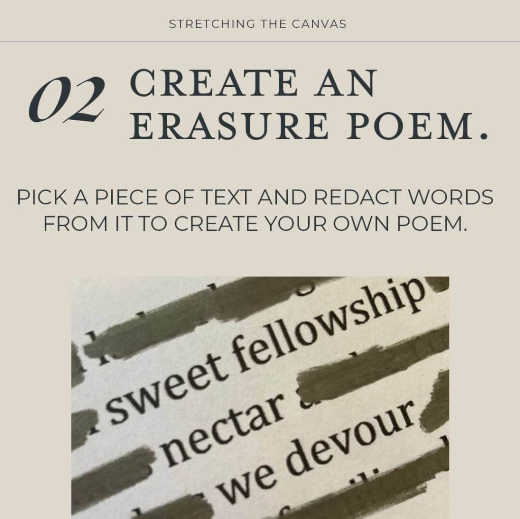 In spring 2020, I attend a Zoom workshop with Jenny Offill on Writing Erasure Poetry and Flash Fiction. The entire session was insightful, but one of the main things I took away from the session was Offill’s idea of “Stretching the Canvas.”