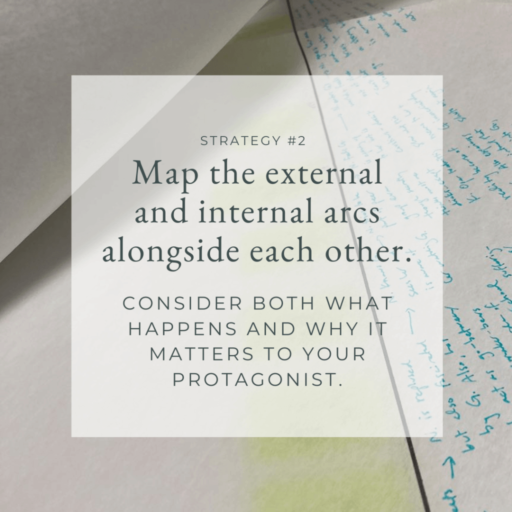 This mapping of the external and internal arc alongside each other is a strategy I tend to use for a second or third draft, basically once I reach the point where I have a sense of both what happens and what the overall journey or insight is internally for the protagonist. I list the external events, and then I also focus on why it matters internally to the character and what they’re learning from that moment, always keeping in mind what their overall internal journey is and where there is the desire for change but also resistance to it.