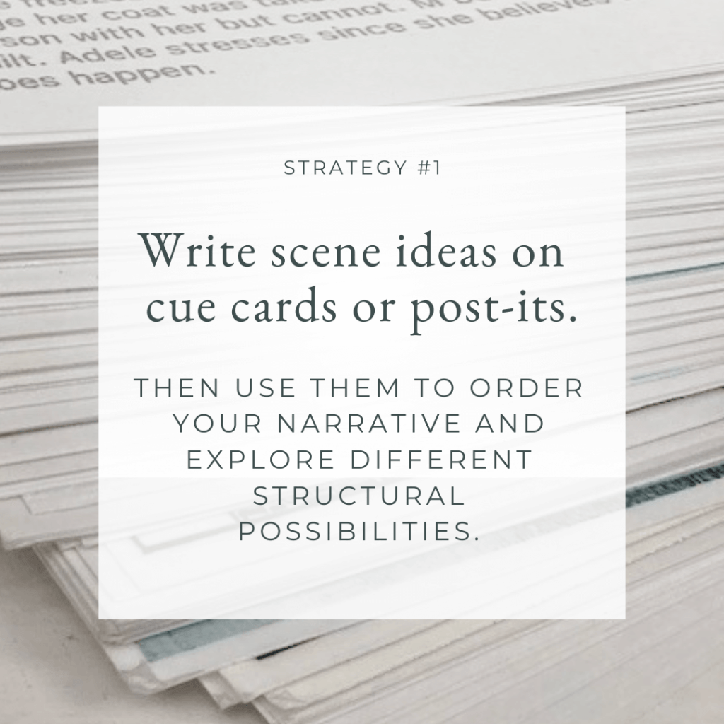 Strategy #1: Write down each scene idea on its own cue card or post-it and then play with different possibilities.